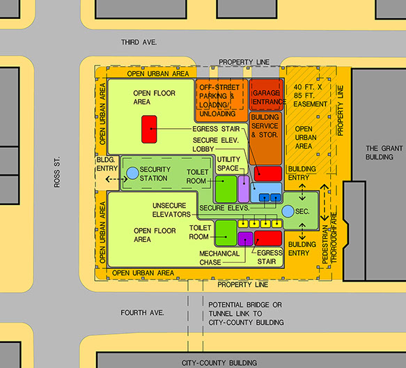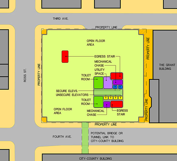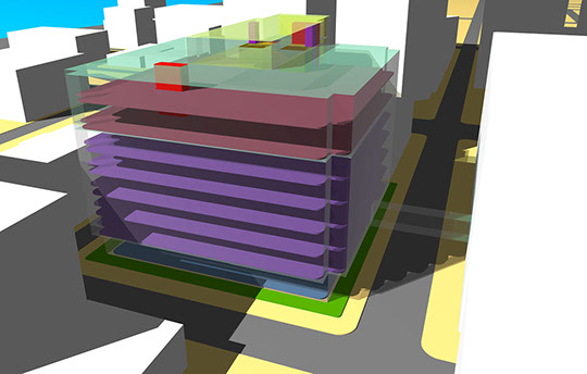 A virtual massing model was developed to study the relationships between the above factors to help the owner understand more clear how they interacted. Color coding of programmed usage was emphasized for clarity.