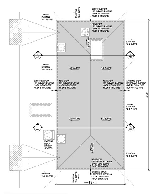 The project can be described as a low-slope roof structure replacement and new roof membrane installation. Based upon the owner’s engineering consultant, and a site inspection by myself, it was clear the existing roof framing needed replacement. In addition to the new roof framing, a new roof membrane was installed over a substrate of structural sheathing and insulation. The new roof was sloped in order to achieve the adequate drainage.