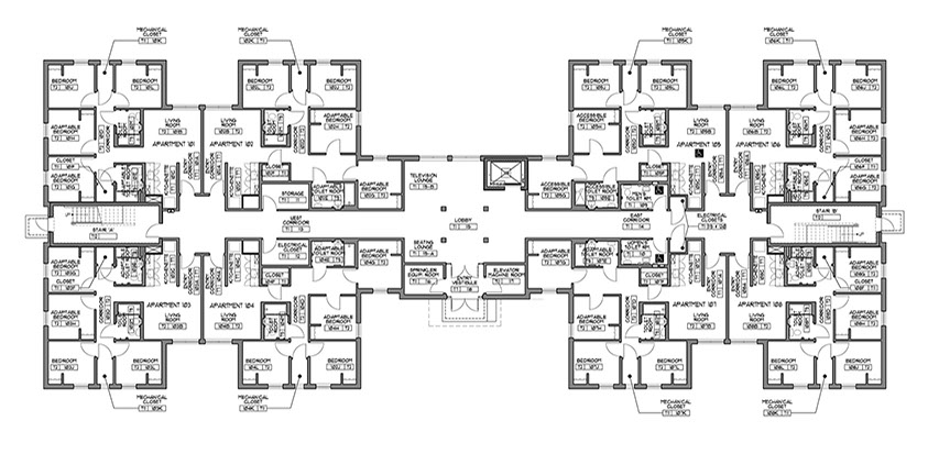 The central area of each floor contained communal spaces that students could use and each floor's community space differed in its purpose. The first floor contained a shared TV lounge, the second floor contained a laundry room, and the third floor contained a conference room that could be used for various purposes.
