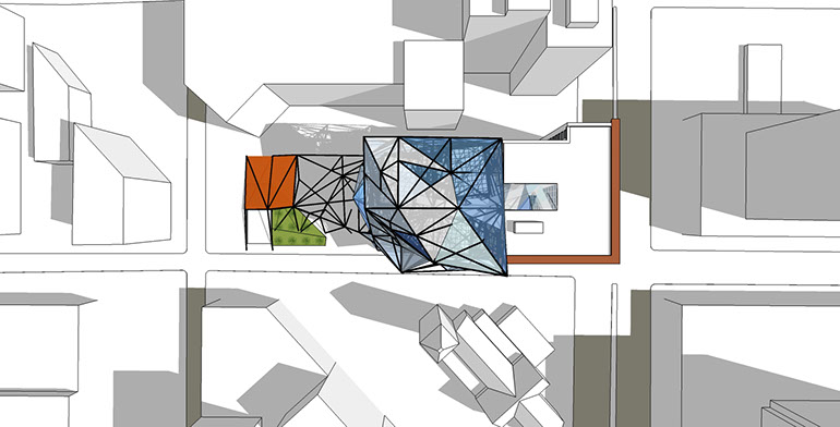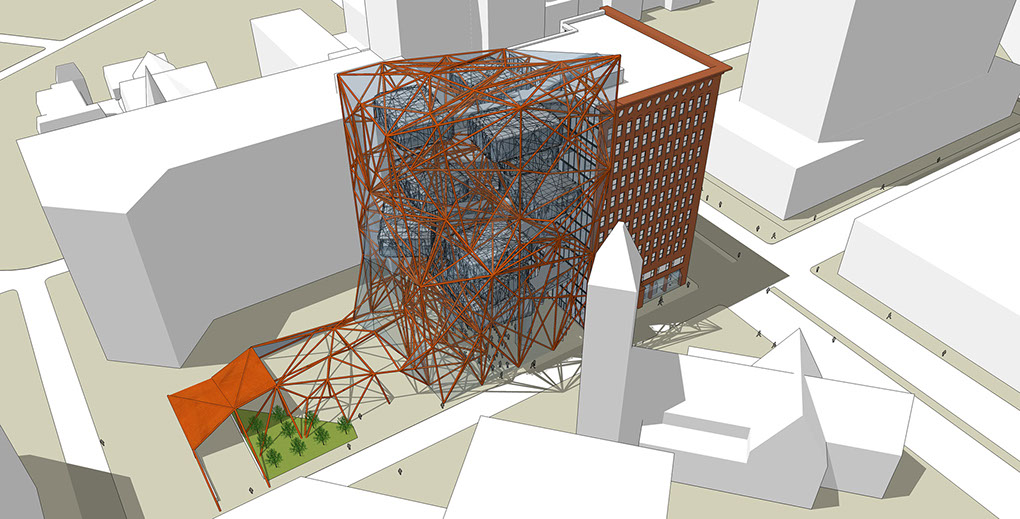 This project focused on the relationship of the original terra-cotta façade/skin over the highly regularized structure. This relationship is reversed in order to study a highly-irregular structure that is placed over a skin/façade.