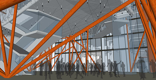 New programmed spaces were suspended from an organic grid of primary structural tubes that responded to the forces exerted upon them. Floating freely from the structure they responded directly to programmatic need rather than structural dictates. The result is a reversal of the skin-structure relationship.